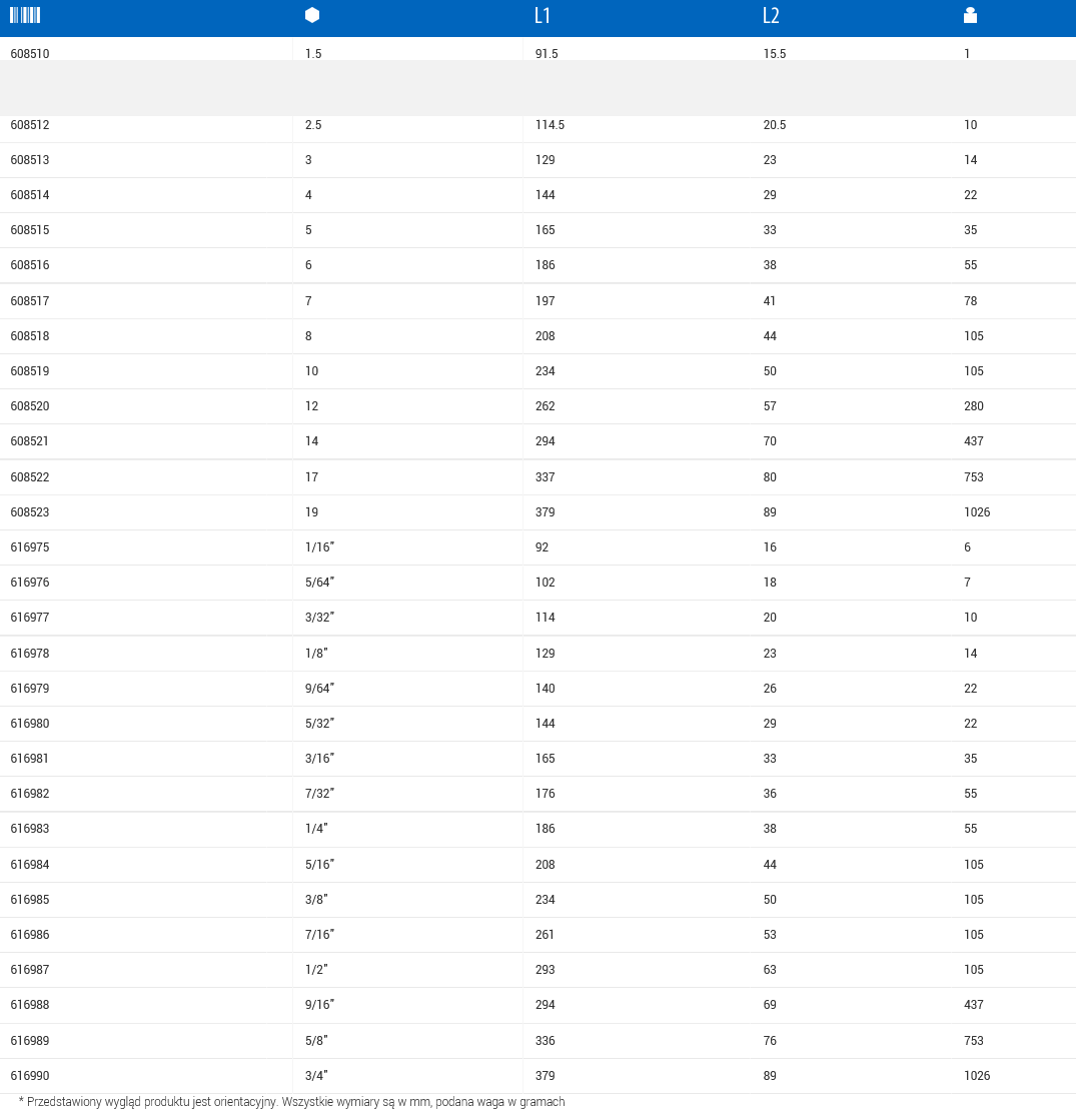 Charakterystyka klucza imbusowego typ długi 220/3L UNIOR: