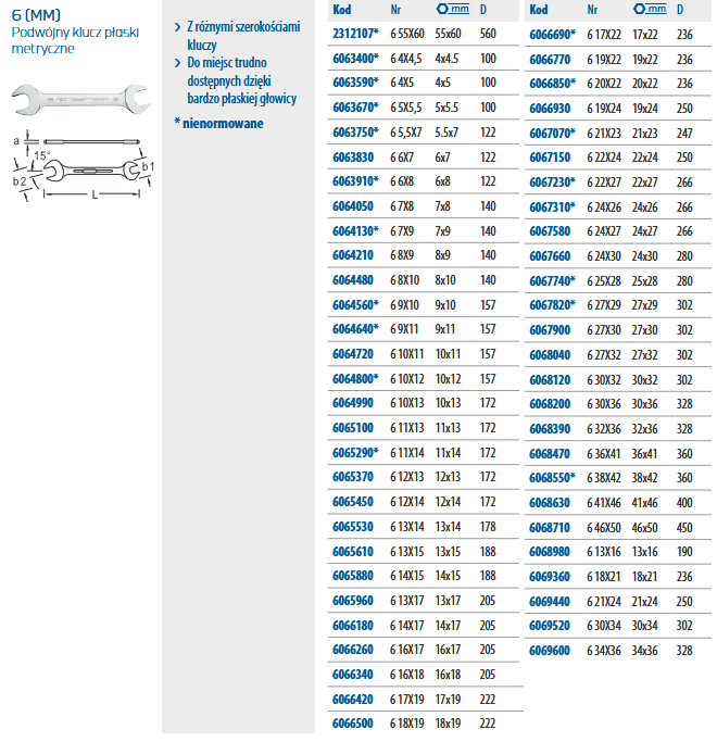 Charakterystyka klucza płaskiego dwustronnego 6 (MM):