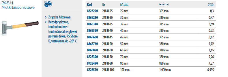 - Bezodrzutowy, trudnołamliwy i trudnościeralne główki polyamidowe, 75 Shore D, testowane do -20° C