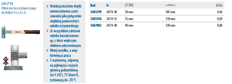 Charakterystyka młotka bezodrzutowego KOMBI-PLUS R 247 H GEDORE:
