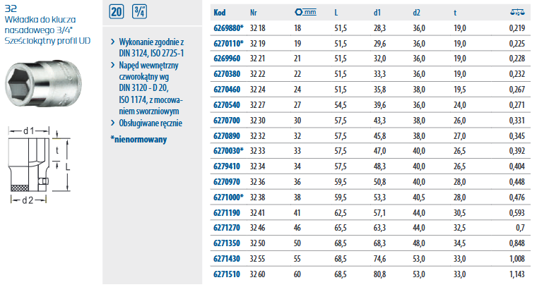 Charakterystyka nasadki 6-kątnej 3/4", 32: