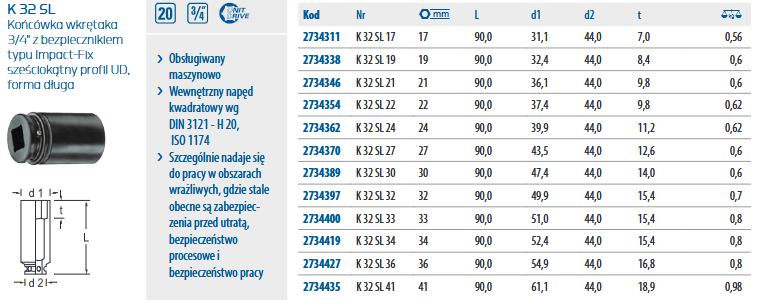 Charakterystyka nasadki udarowej długiej 6-kątnej 3/4" K 32 SL GEDORE: