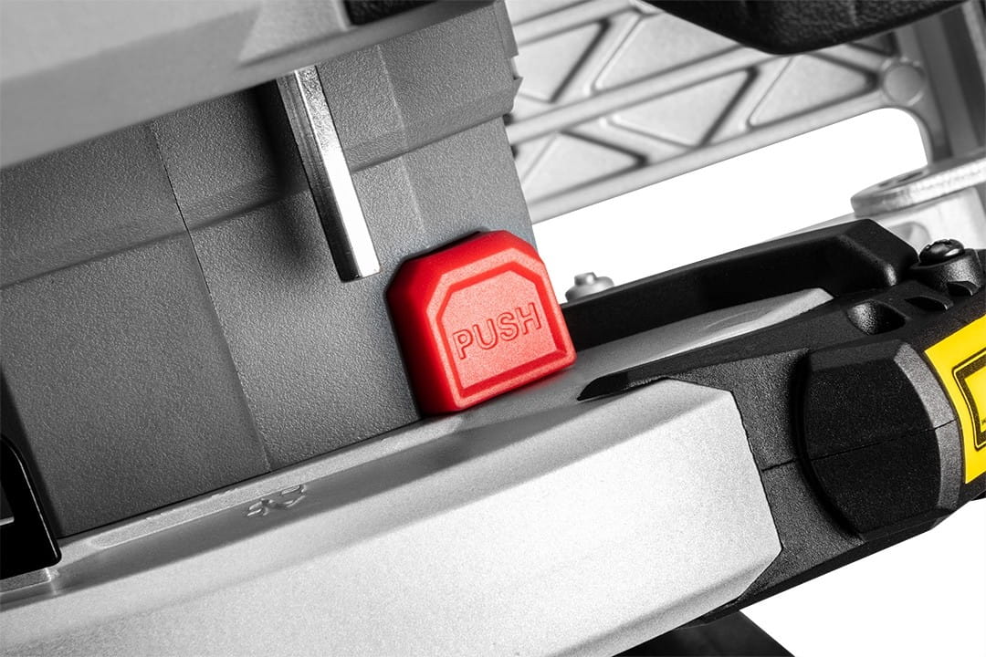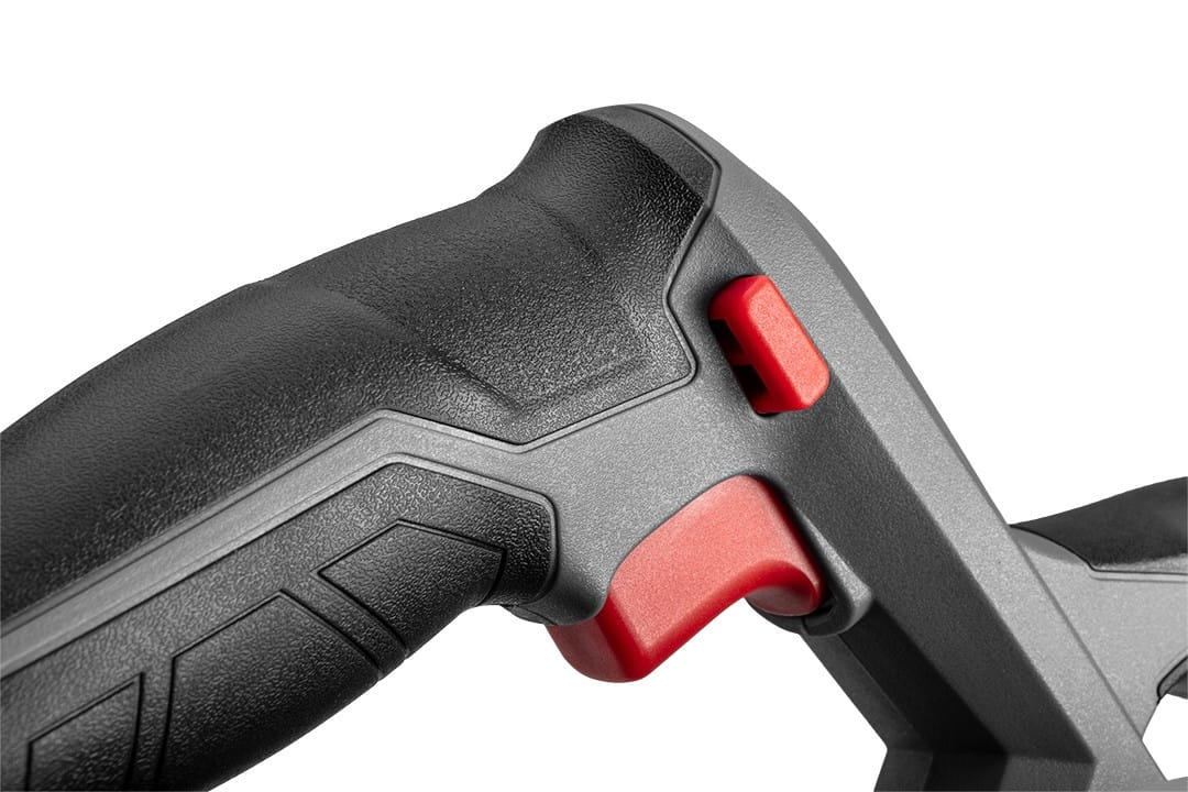 - Pilarka została wyposażona w uchwyt z blokadą chroniącą przed przypadkowym włączeniem, pokryty antypoślizgowym tworzywem, dzięki czemu praca jest wygodna i bezpieczna