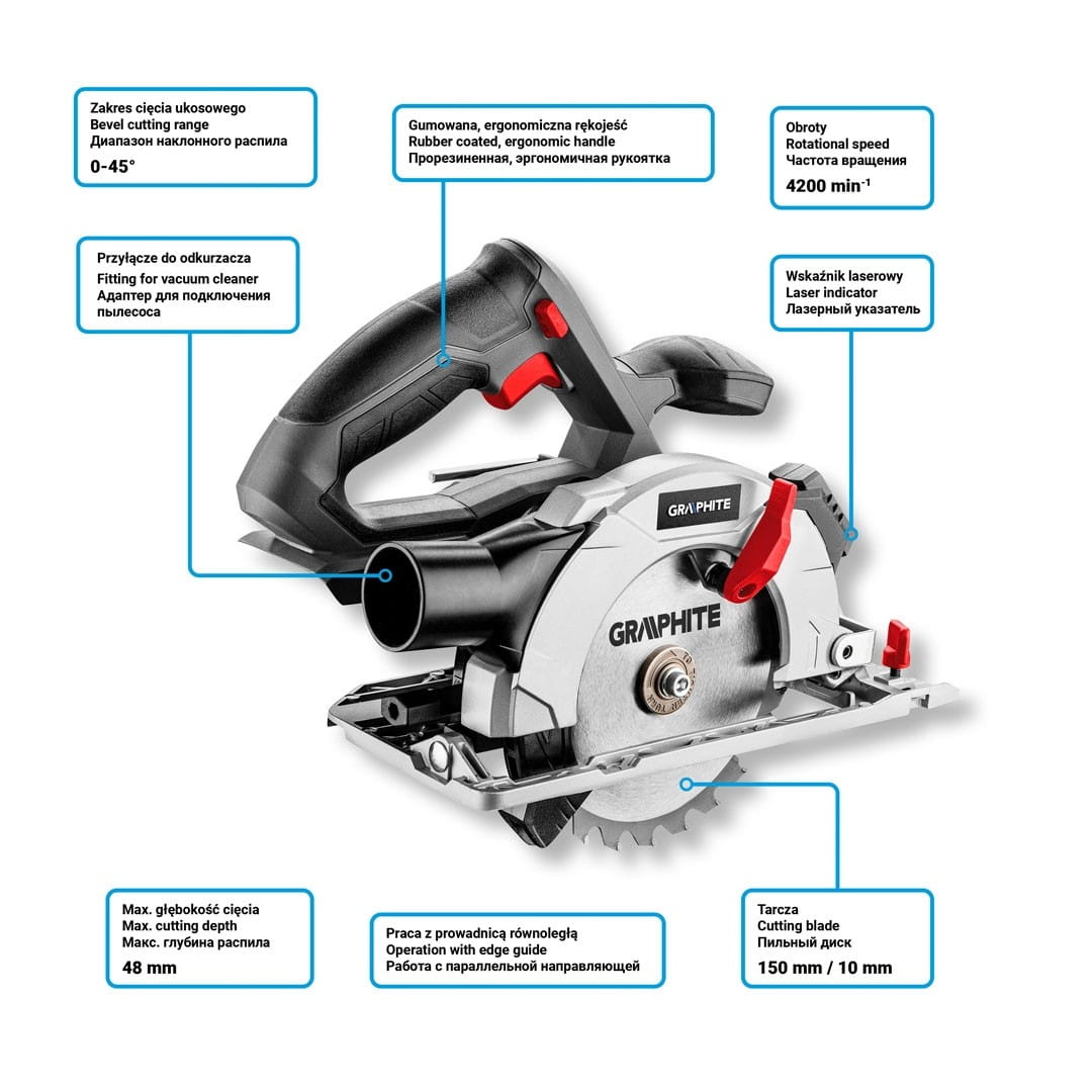 - Pilarka tarczowa GRAPHITE, współpracująca z akumulatorami 18V Li-Ion GRAPHITE Energy+