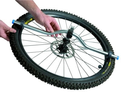 - Przyrząd ten służy do kontroli symetrii piasty względem obręczy koła. Najpierw ustalamy odpowiednie dla danej średnicy obręczy położenie ślizgów. Następnie przykładamy ślizgi do obręczy koła i dokręcamy uchwyt przyrządu do piasty. Następnie przekładamy narzędzie na drugą stronę koła. Teraz zmożemy sprawdzić czy piasta jest prawidłowo wycentrowana z osią koła. Jeśli nie, musimy to skorygować.