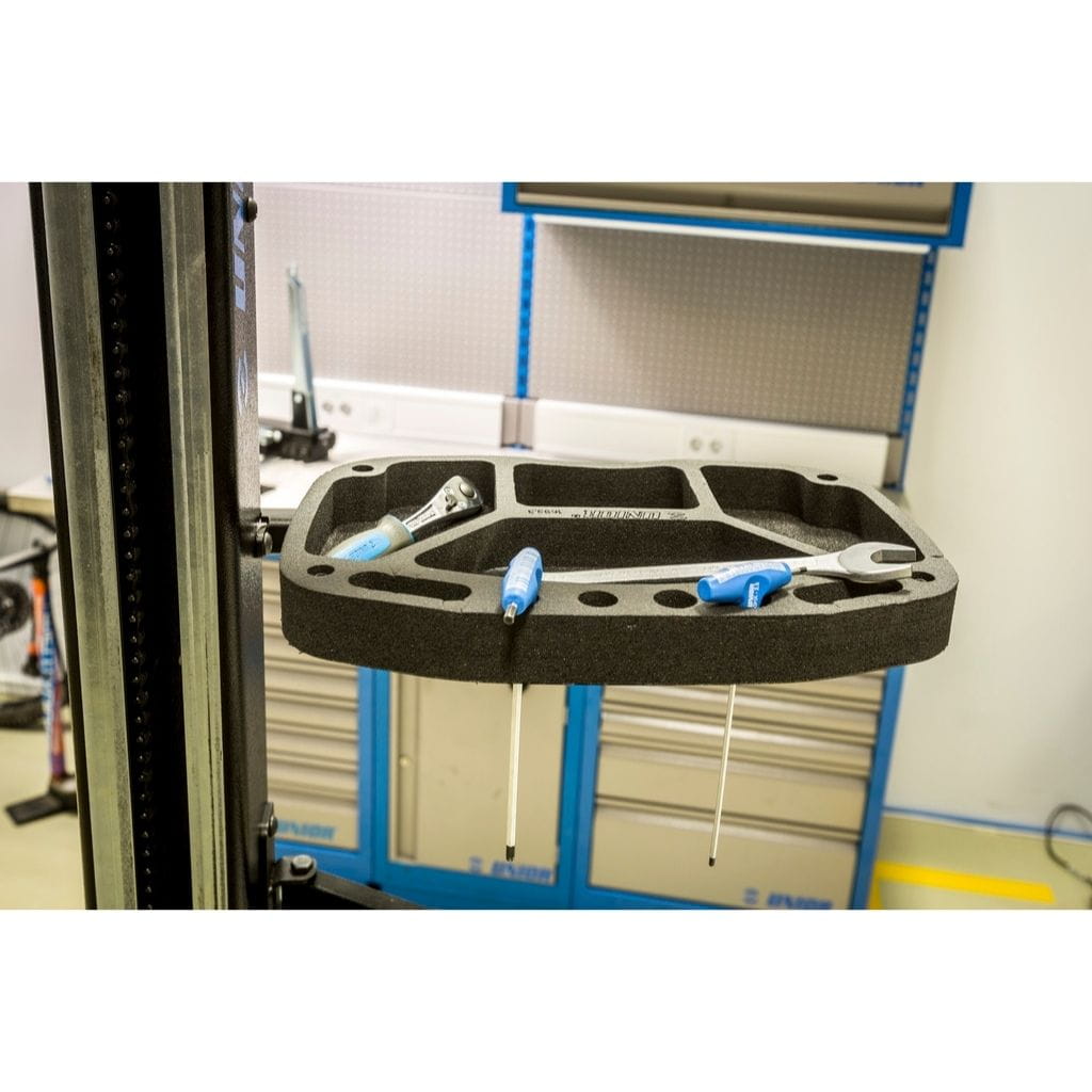 - Taca narzędziowa jest montowana do kolumny elektrycznego stojaka naprawczego Unior i zapewnia optymalne umieszczenie tacy narzędziowej