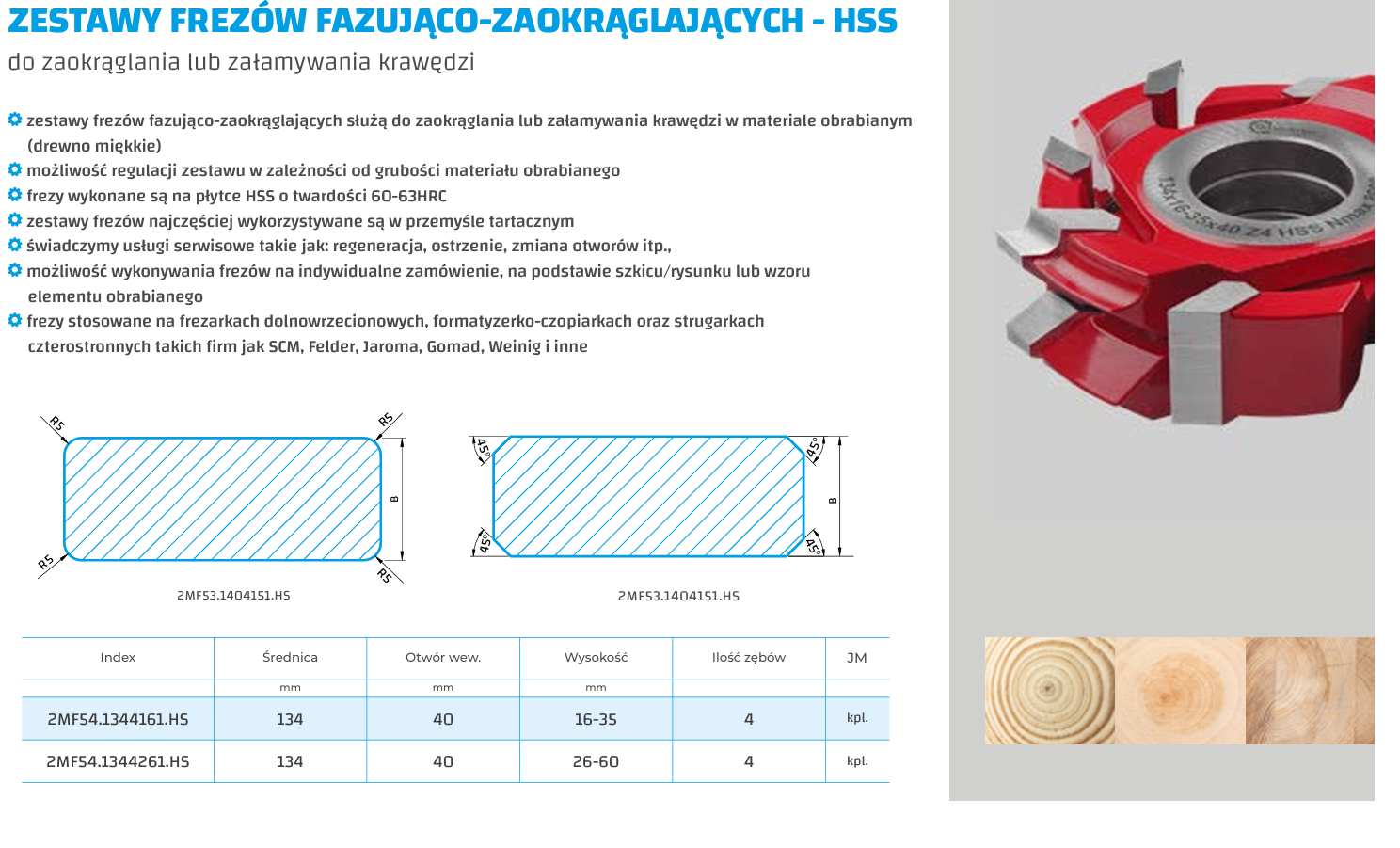 - Zestawy frezów fazująco-zaokrąglajacych służą do zaokrąglania lub załamywania krawędzi w materiale obrabianym (drewno miękkie)