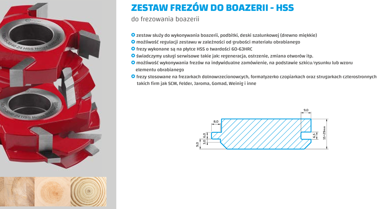 - Frezy stosowane na frezarkach dolnowrzecionowcych, formatyzerko czopiarkach oraz strugarkach czterostronnych takich firm jak SCM, Felder, Jaroma, Gomad, Weinig i inne
