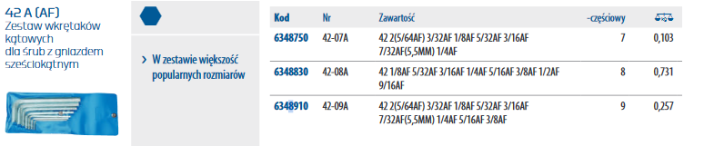 - 42-07A - 7 szt. (2(5/64AF), 3/32AF, 1/8AF, 5/32AF, 3/16AF, 7/32AF, (5,5MM) 1/4AF)