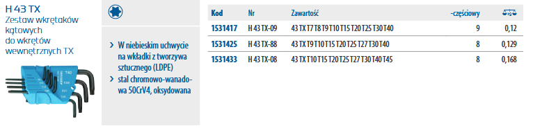Charakterystyka zestawu kluczy trzpieniowych torx H 43 TX: